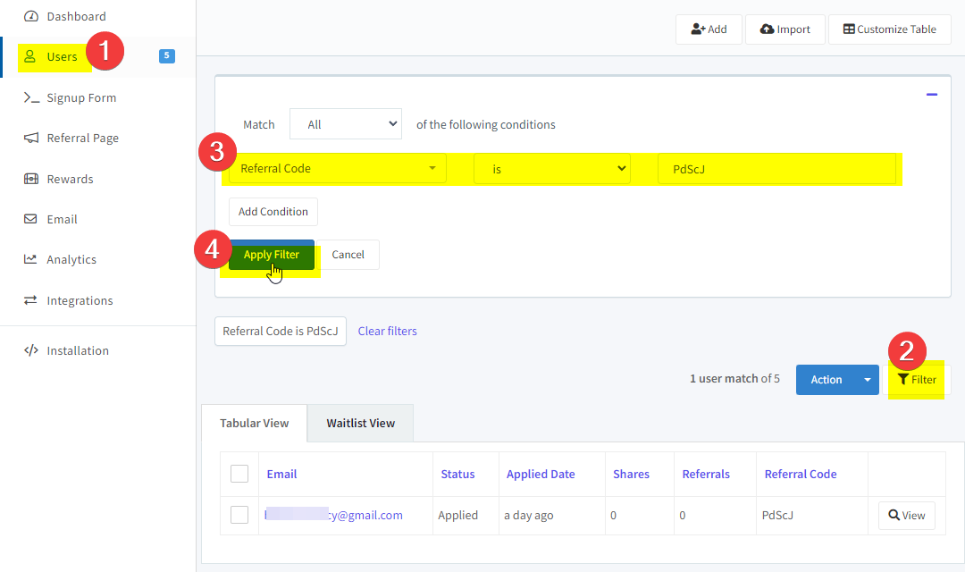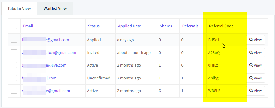 Go to Users > Customize Table from your project dashboard to display the Referral Code column on the Tabular View.