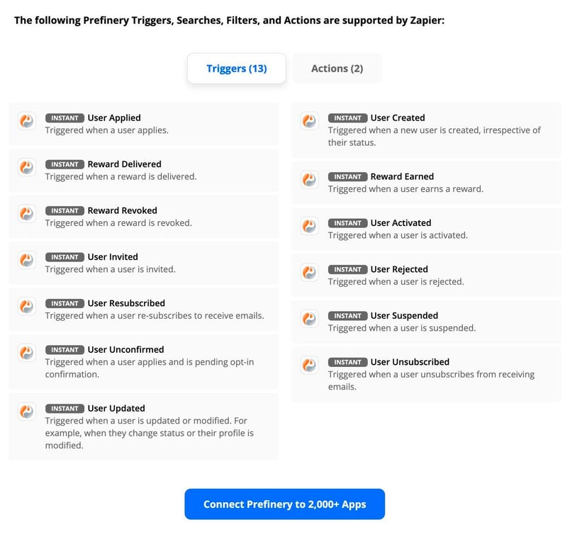 You can easily tell Prefinery about custom events which trigger rewards by using Prefinery's API or via our new Zapier Trigger Rewards action.