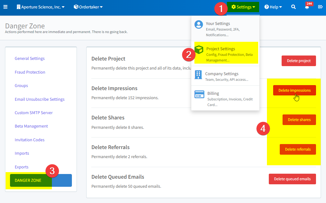 To provide you the ability to reset your project data after doing your testing, you can now delete all impressions, shares and referrals as needed.